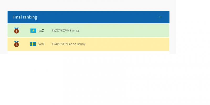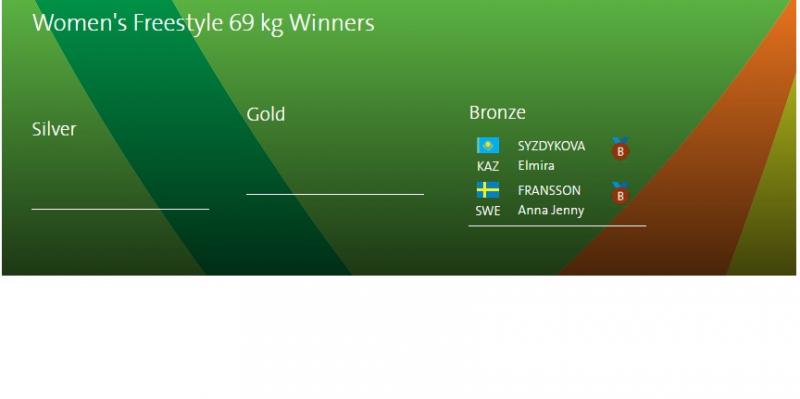 Эмэгтэйчүүдийн чөлөөт бөхийн 69 кг жингийн хүрэл медалийн төлөөх эхний барилдаанд Казакстаны тамирчин Элмера Сездекова, Египетийн бөх Энис Мустафатай таарч барилдлаа. Барилдааныг Элмера Сездекова 7:4 онооны харьцаагаар ялж, хүрэл медалийн болзол хангав.