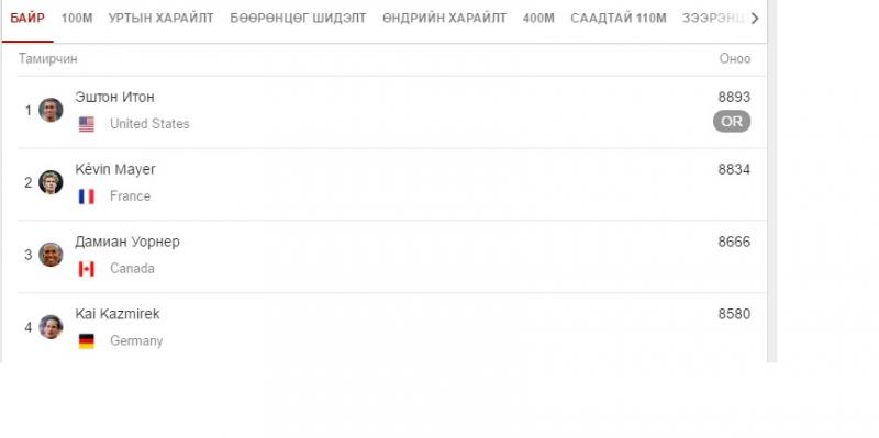 Тэмцээний хоёрдугаар байрт Францын тамирчин Кевин Мейр 8834 оноогоор орж, мөнгөн медалийн эзэн болж байна. Хүрэл медалийг Канадын тамирчин Дамиан Уорнер 8666 оноог цуглуулснаар хүртсэн юм.