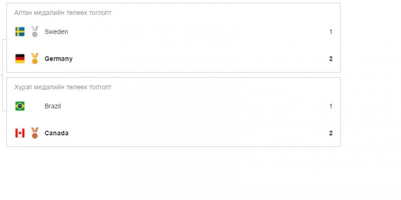 Тэд финалын тоглолтод Шведийн багийг 2:1-ээр хожиж алтан медалийн эзэн болсон юм. Мөнгөн медалийг Швед улс хүртсэн бол хүрэл медалийг Канадын баг тамирчид Бразилийн шигшээ багийг хожсоноор авч чадлаа.